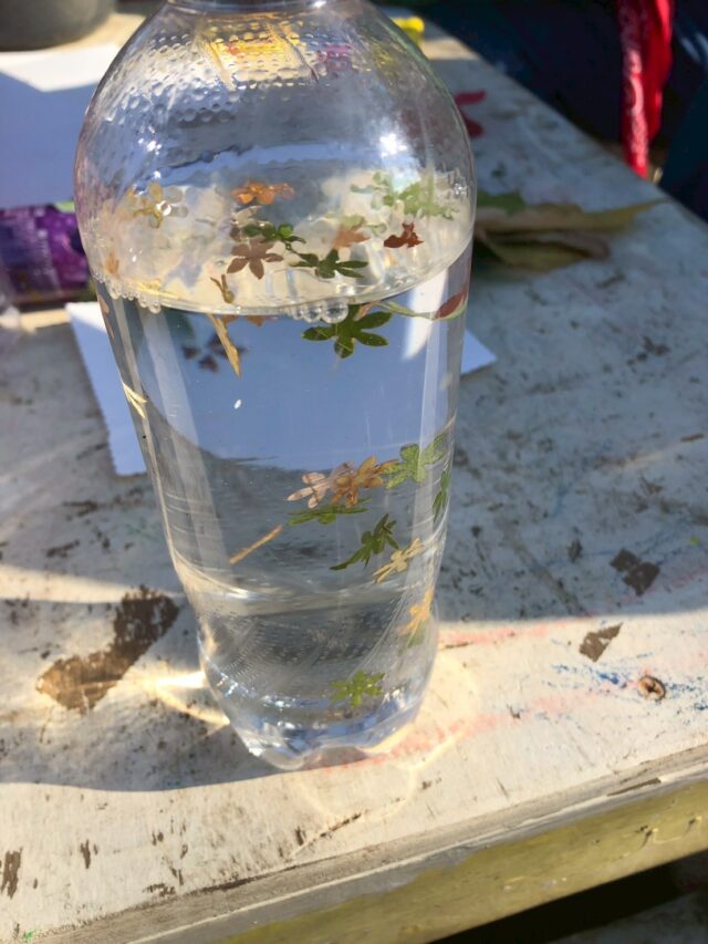 パンチした葉っぱを、水をいれたペットボトルに入れて、ハーバリウムを作ったり。