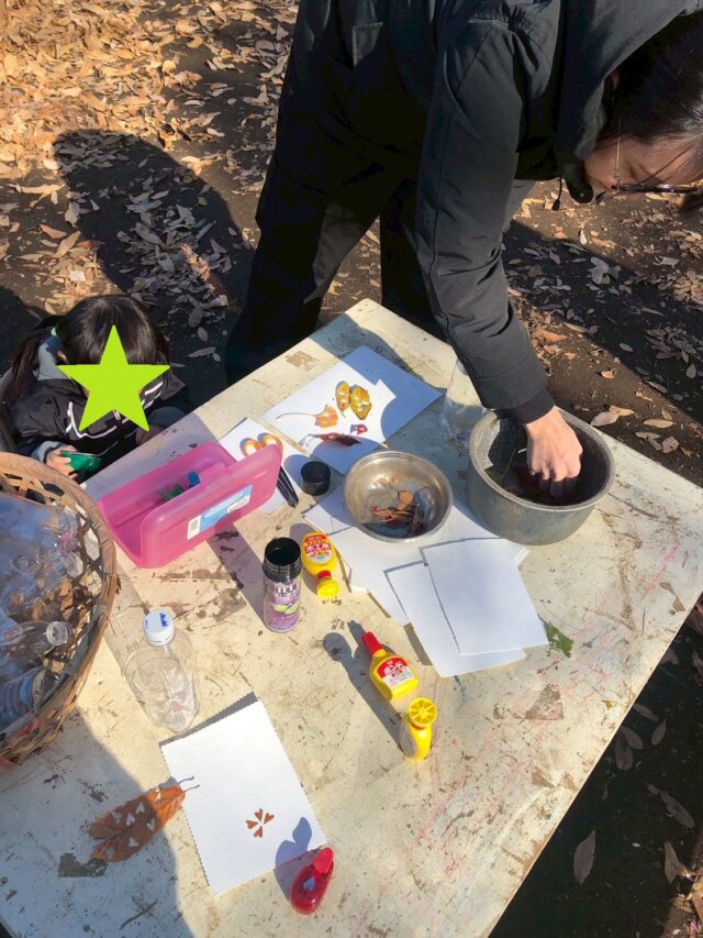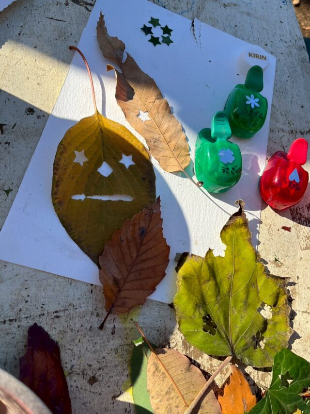 穴あけパンチやハサミで葉っぱに穴をあけて、かわいいちゃんを作ったり。
